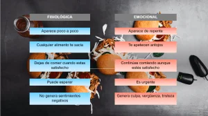 Por otra parte, es importante discriminar que en el hambre fisiológica sí percibimos una sensación física de hambruna, no urgente y sin estar relacionada con ningún alimento específico.